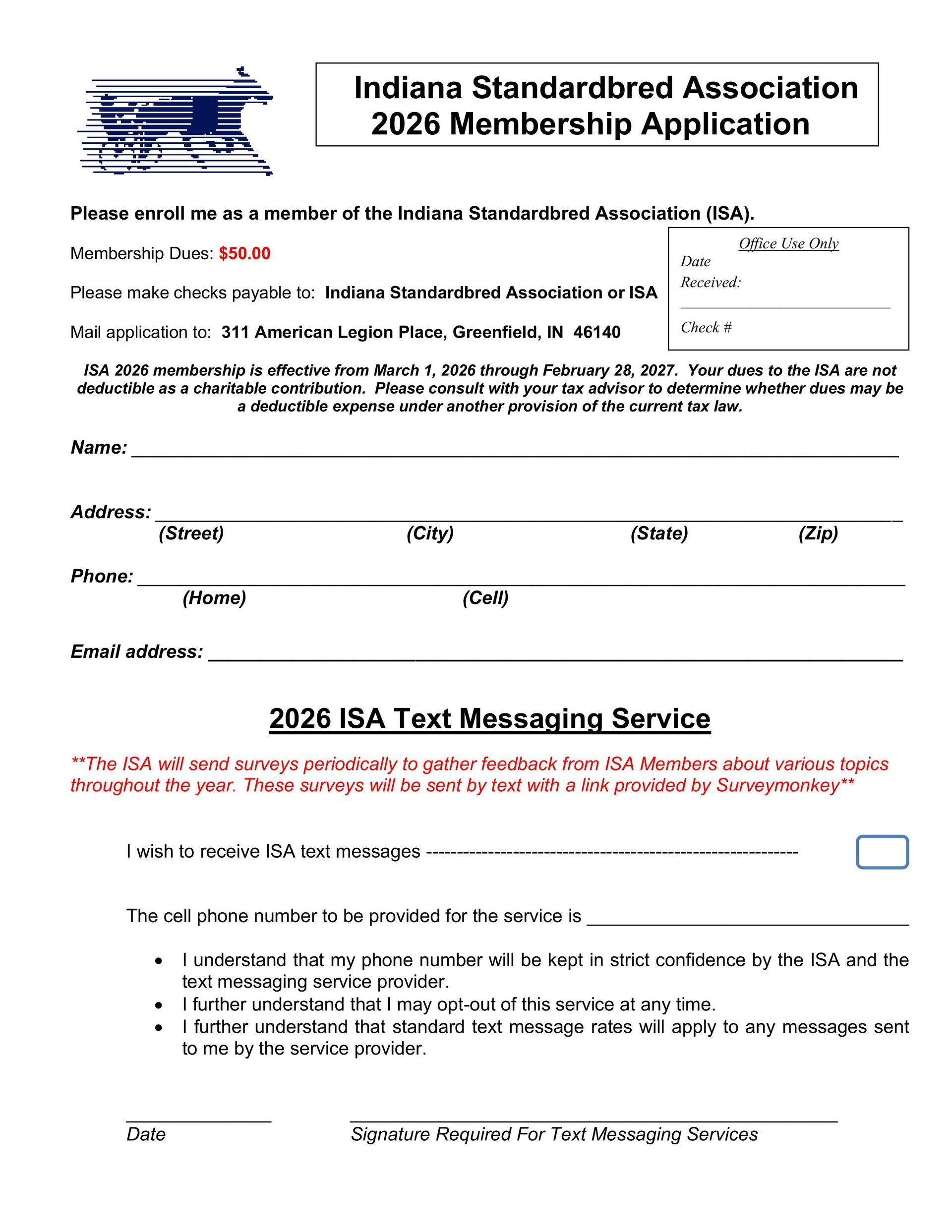 To become a member of the ISA, send in the application to the ISA Office by mail at 311 American Legion Place, Greenfield, IN 46140. Applications are available online on the ISA Website at indianaharness.com, or applications may be obtained by the ISA Horsemen’s Representative at Harrah’s Hoosier Park from either Rick or Casandra Uppal.
