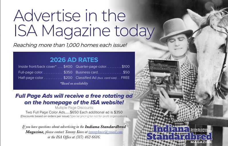 If you have questions about advertising in the Indiana Standardbred Magazine, please contact Tammy Knox at tammyknox@ymail.com or the ISA Office at (317) 462-6616.